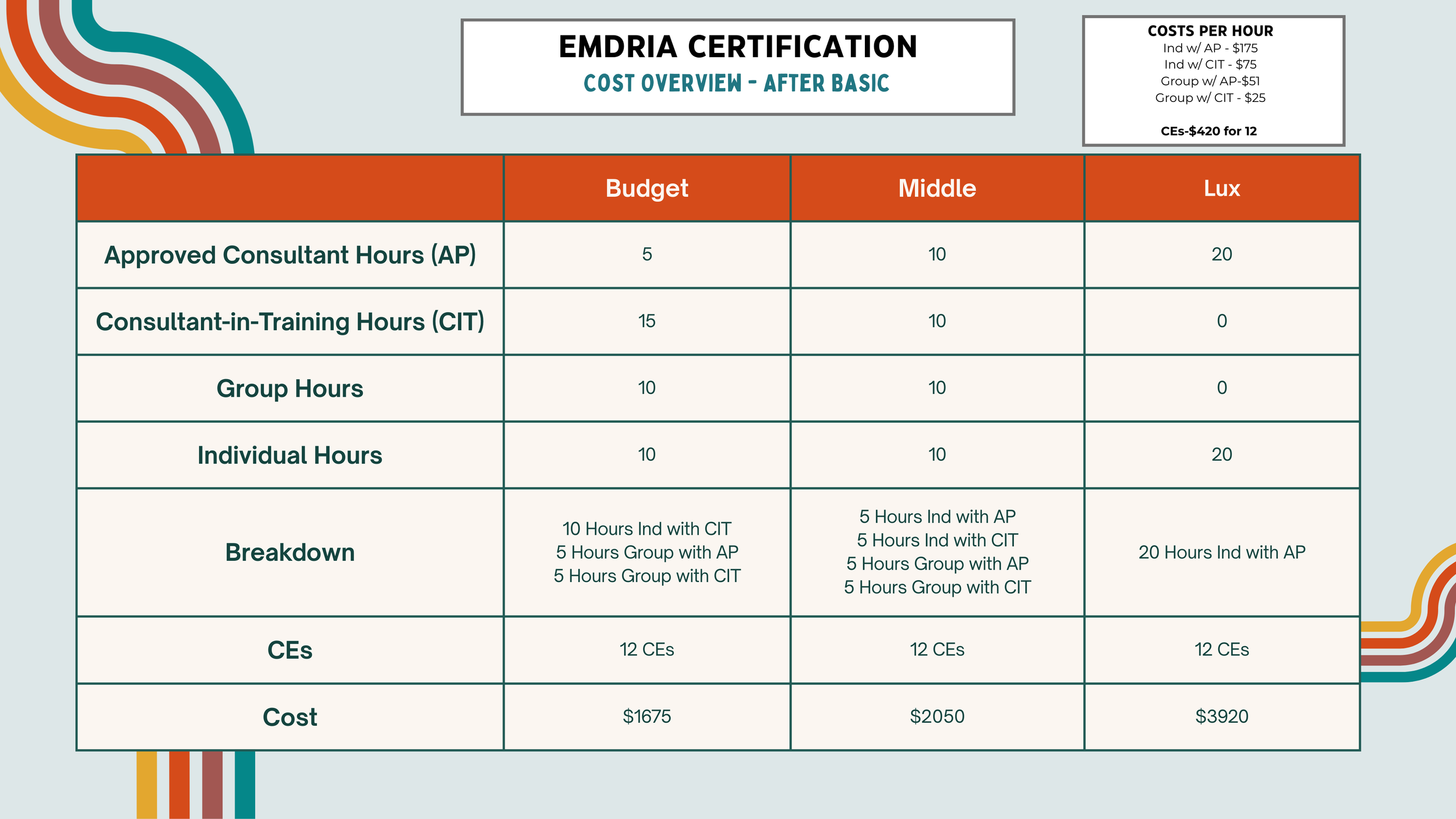 As one can see, you can obtain EMDRIA certification through a variety of consultation modalities. The budget option certainly has appeal, but requires a bit more detailed tracking of your hours, as they may come from more sources. The hours of individual consultation will be the biggest contribution to the overall cost.